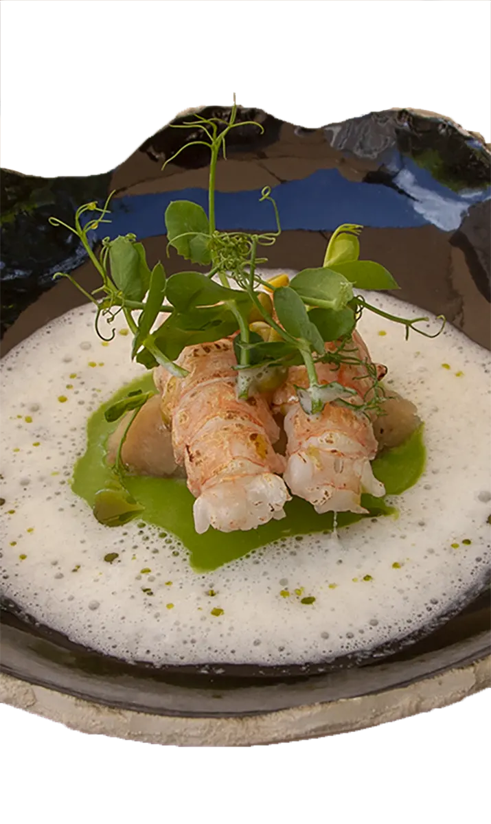 Gebrande coquille | Bospeen | Tapenade kapperappeltjes & ansjovis | Saké saus